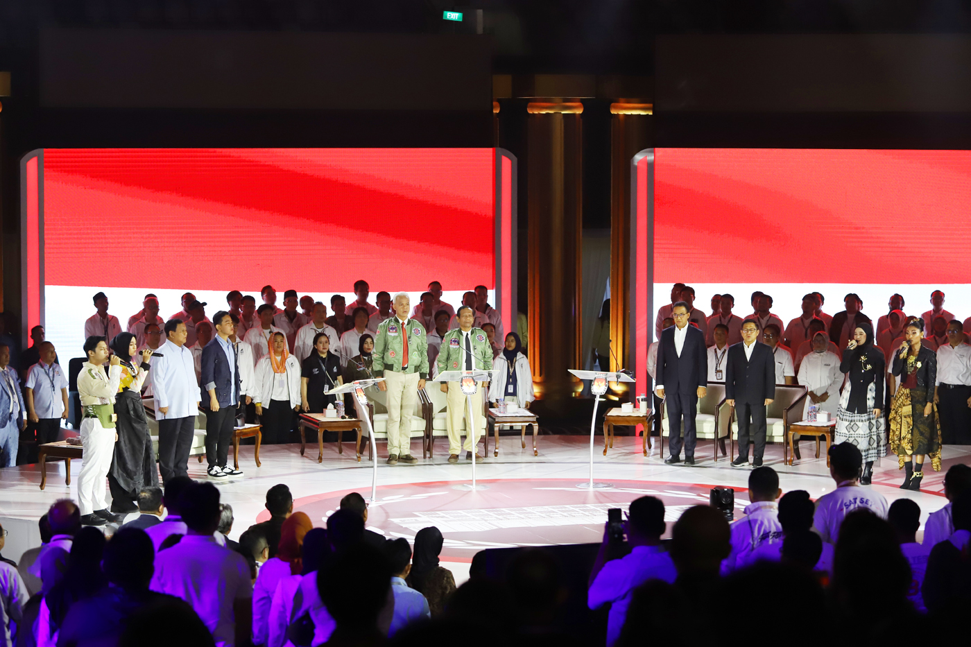 Capres-cawapres nomor urut satu Anies Baswedan dan Muhaimin Iskandar (kanan), capres-cawapres nomor urut dua Prabowo Subianto dan Gibran Rakabuming Raka (kiri), dan capres-cawapres nomor urut tiga Ganjar Pranowo dan Mahfud MD menyanyikan lagu Indonesia Ra