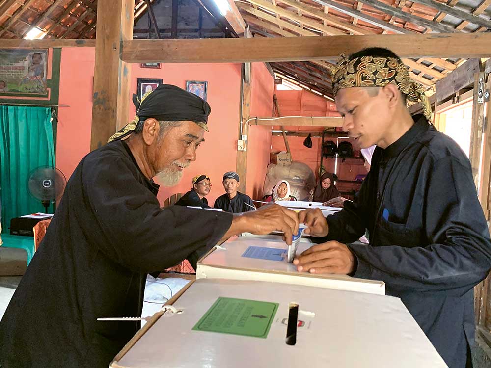 Bukan hanya Sedulur Sikep yang berpakaian adat Samin saat nyoblos, tetapi juga para anggota kelompok penyelenggara pemungutan suara (KPPS) TPS 04. Yang laki-laki memakai ikat kepala (udeng). Perempuan mengenakan kebaya hitam dengan bawahan batik. (hib/hul/bgs/c14/ttg)