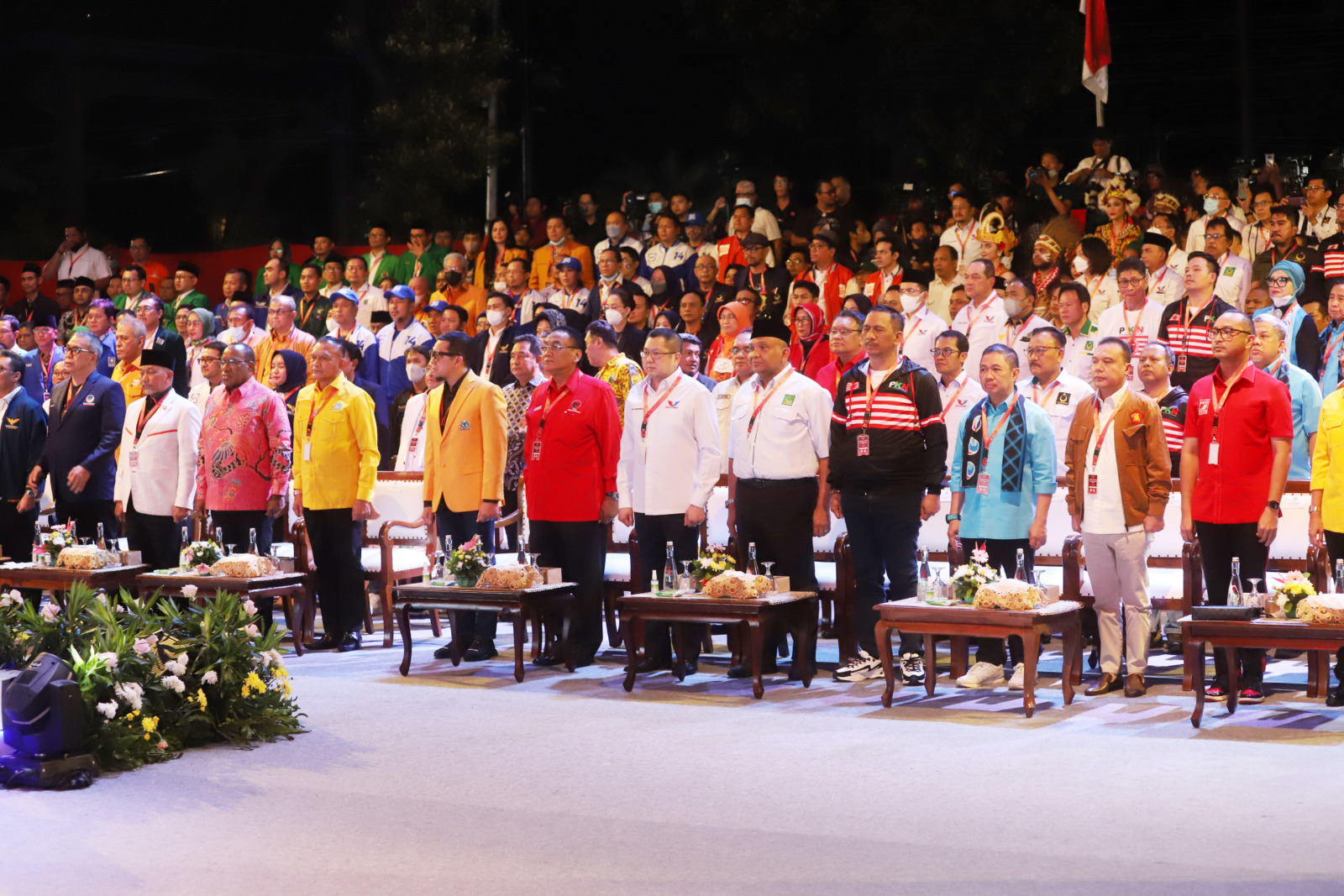Para pimpinan partai Politik saat menghadifi acara pengundian nomor urut partai politik di gedung Komisi Pemilihan Umum, Jakarta, Rabu (14/12/2022). KPU resmi mengumumkan no urut partai politik. Sebanyak 17 partai nasional dan enam partai lokal Aceh yan