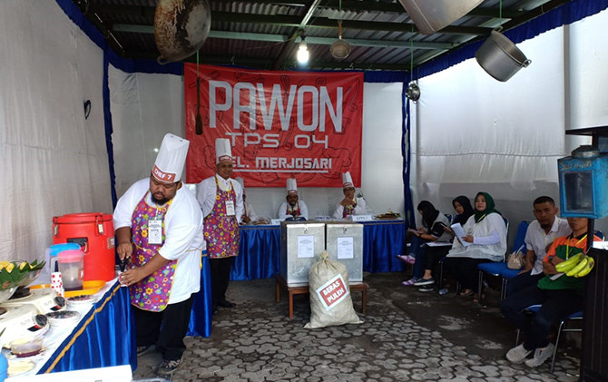 Ya, TPS tersebut mengusung tema Master Chef. Namanya pun Pawon TPS 4, Kelurahan Merjosari. Pawon dalam bahasa Jawa berarti dapur. Di depan TPS, pemilih akan disambut gerobak berwarna coklat. Di salah satu sisinya tergantung buah pisang yang bisa dinikmati warga yang menyalurkan hak suara.
