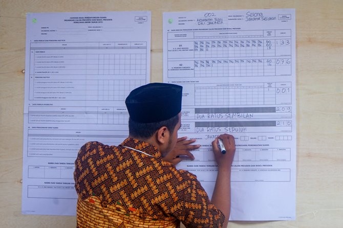 Anggota Kelompok Penyelenggara Pemungutan Suara (KPPS) TPS 02 melakukan perhitungan suara pemilihan Presiden 2019 di Jalan Sriwijaya, Jakarta Selatan, Rabu (17/4). Issak Ramdhani/JawaPos.com - Image
