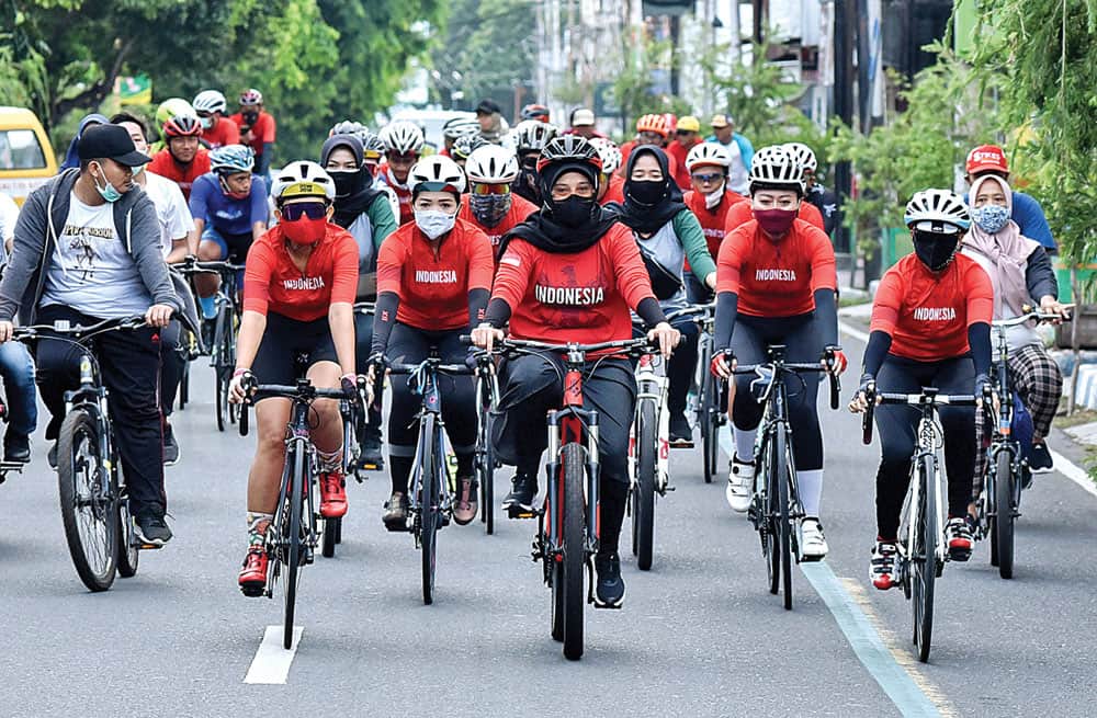 Calon bupati Banyuwangi Ipuk Festiadani Azwar Anas (tengah, berkerudung) bersama komunitas sepeda. (RAMADA/JAWA POS RADAR BANYUWANGI)
