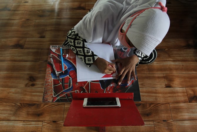 Sejumlah anak-anak sekolah mengikuti belajar secara daring atau online dengan fasilitas WiFi yang disediakan secara gratis oleh warga di Perumahan Pondok Mulya I, Beji, Depok, Rabu (29/7/2020). WiFi gratis ini oleh warga sekitar kompleks perumahan sebagai