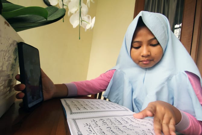 Siswa Sekolah Dasar Islam Terpadu (SDIT) Al-Mardhiyah melakukan pembelajaran jarak jauh dengan sistem Dalam Jaringan (Daring) dari rumah di Perumahan Villa Naira di Bekasi, Jawa Barat, Jumat (17/7/2020). Sekolah dengan tetap menerapkan sistem PJJ di awal