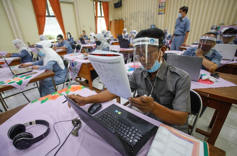 Sejumlah guru SMPN 1 Surabaya melakukan pembelajaran secara daring bersama murid-muridnya di ruang media SMPN 1 Surabaya, kemarin, Senin (23/11/2020). Walikota Surabaya Tri Rismaharini mengeluarkan surat putusan yang ditujukan untuk guru pengajara SD dan