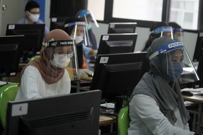 Peserta mengikuti Ujian Tulis Berbasis Komputer (UTBK) di Universitas Negeri Jakarta (UNJ), Jakarta, Minggu (5/7/2020). UNJ sebagai salah satu Pusat UTBK Perguruan Tinggi Negeri (PTN) menyelenggarakan ujian dalam dua tahap yakni pada tanggal 5-12 Juli 202