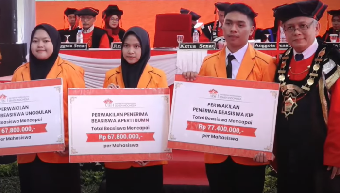 Rektor UISI Prof. Herman Sasongko menyerahkan beasiswa unggulan diwakilkan Hasifa Salsabila Putri yang berasal dari Ponorogo. Dia akan meempuh Program Studi Teknik Kimia. Lalu Beasiswa Aperti BUMN diwakilkan Siti Sarazea, mahasiswi Teknik Logistik dari Sukabumi dan perwakilan penerima beasiswa KIPK oleh Suwandi Erianto Sinaga, mahasiswa Teknologi Agroindustri dari Toba, Samosir.
