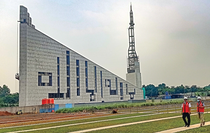 IKON KAMPUS: Sekretaris UIII Chaider S. Bamualim (kiri) meninjau pembangunan masjid kampus UIII di kompleks UIII di Depok, Jawa Barat, kemarin (7/6). (HILMI SETIAWAN/JAWA POS)