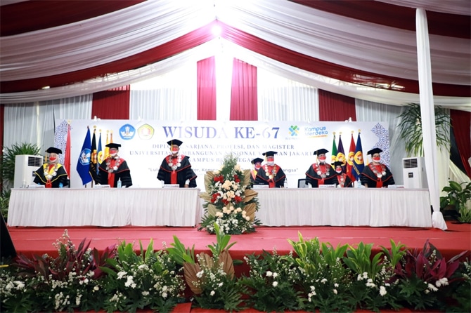 Rektor UPNVJ Dr Erna Hernawati, Ak, CPMA, CA, CGOP dalam sambutannya mengatakan, program vaksinasi saat ini sudah cukup masif. PPKM di DKI Jakarta juga sudah memungkinkan untuk sejumlah aktivitas dihelat secara terbatas. ”Maka, UPNVJ mencoba untuk mulai melakukan wisuda ke-67 ini secara offline dengan protokol kesehatan ketat,” ujarnya.