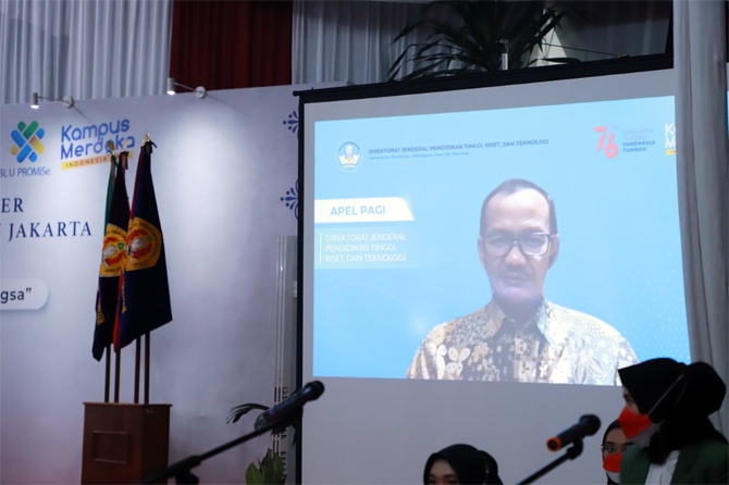 Dirjen Pendidikan Tinggi Kementerian Pendidikan, Kebudayaan, Riset, dan Teknologi Prof Ir Nizam, MSc, PhD, IPM, ASEAN Eng juga menyampaikan sambutan dan ucapan selamat secara daring.