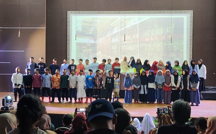 Siswa SD 5 Sekolah Alam Indonesia (SAI) saat menggelar pementasan dalam acara Language Fair 2024 yang di Gelar di Gedung IX Fakultas Ilmu Budaya (FIB) Universitas Indonesia (UI), Depok, Minggu, (25/2)