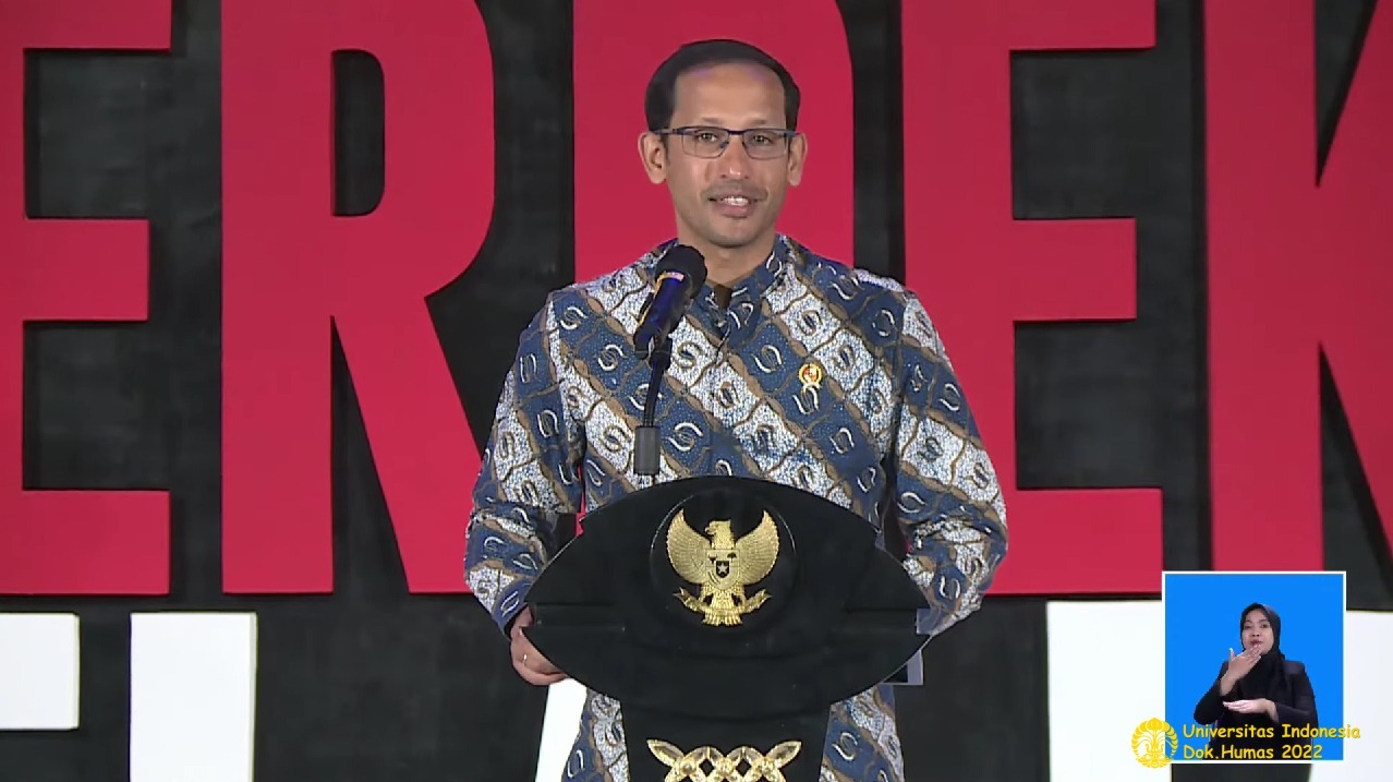 Mendikbudristek Nadiem Anwar Makarim mengumumkan program penyaluran dana abadi pendidikan untuk PTNBH di Jakarta (27/6). Foto : Dokumentasi UI