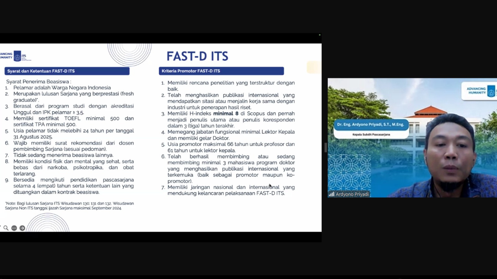 Untuk mendukung keberhasilan program ini, ITS juga mengatur syarat ketat bagi para dosen pembimbing (promotor). Promotor harus bergelar doktor, memiliki jabatan minimal Lektor Kepala, dan memiliki H-indeks Scopus minimal 8 untuk Beasiswa FAST-D dan Unggulan, serta minimal 6 untuk program Global Excellence Scholarship.