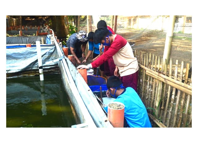 BERDAYAKAN SANTRI: Para santri Pondok Modern Al-Rifa’ie 2 beternak lele di lingkungan pesantren. (Al-Rifa’ie 2 for Jawa Pos)