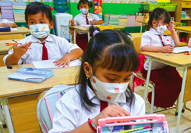 DI DALAM KELAS: Siswa SDN Kaliasin 1 Surabaya saat proses pembelajaran tatap muka (PTM). minggu lalu. Pemerintah Kota Surabaya akan memberlakukan pembatasan PTM dengan satu sesi. (Frizal/Jawa Pos)