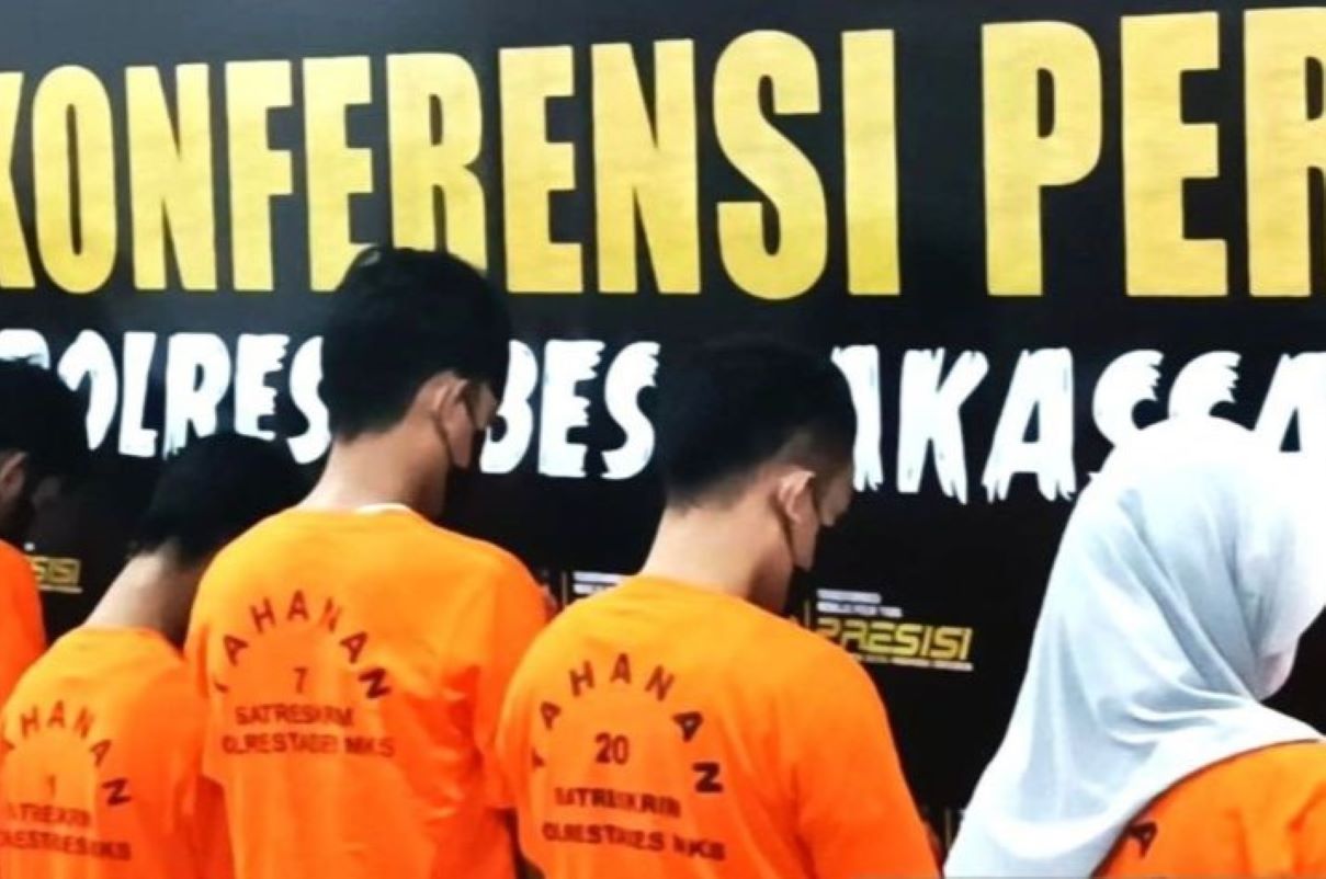 Para tersangka jaringan sindikat Joki seleksi UTBK-SNBT 2025 Universitas Hasanuddin (Unhas) saat pengungkapan kasus di Mapolrestabes Makassar. (Darwin Fatir/Antara)