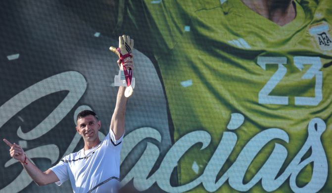 MARA SOSTI/AFP PULANG KAMPUNG: Kiper Argentina Emiliano Martinez menyapa para penggemar di kota kelahirannya, Mar del Plata, kemarin (23/12) WIB.
