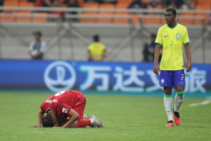 Striker Iran U-17, Yaghoob Barajeh (kiri), sujud syukur setelah timnya meraih kemenangan atas Brasil U-17 dengan skor 3-2. (LOCWC17/BRY)