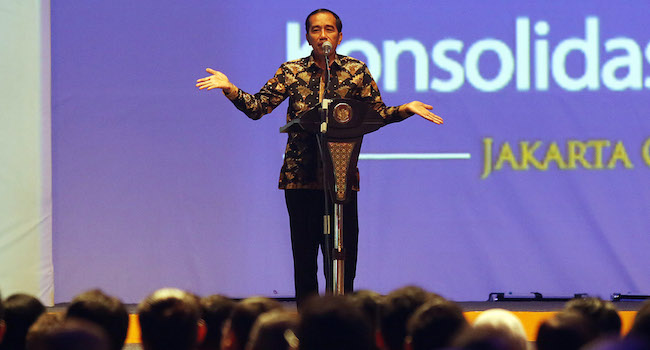 Presiden Joko Widodo saat berpidato pada pembukaan rapat kerja nasional Partai NasDem di Jakarta, Senin (21/9) malam.