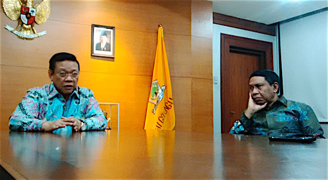 Ketua Umum Partai Golkar hasil musyawarah nasional Ancol, Agung Laksono dan sekretaris jenderalnya, Zainuddin Amali di kantor DPP Golkar, Slipi, Jakarta Barat, Jumat (6/11).