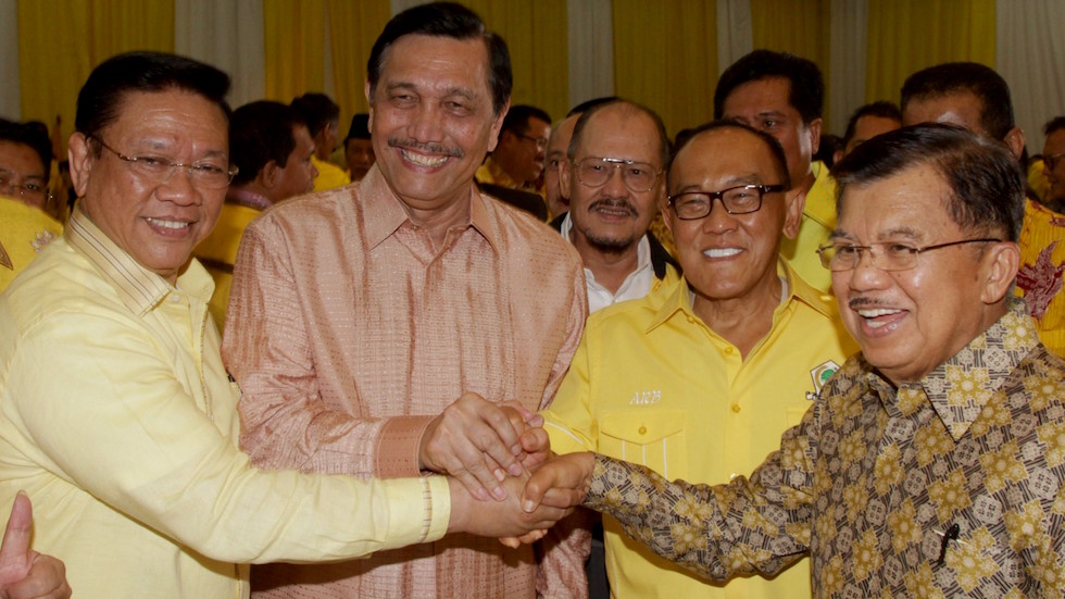 Ketua umum Golkar hasil musyawarah nasional (munas) Ancol, Agung Laksono (paling kiri) bersama tokoh senior Golkar Luhut B Panjaitan, Ketua Umum Golkar hasil munas Bali, Aburizal Bakrie dan Wakil Presiden Jusuf Kalla dalam acara Silatnas Golkar beberapa w