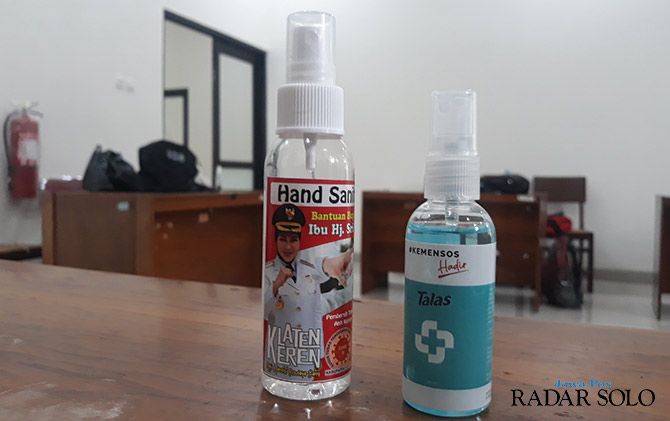 Hand sanitizer berstiker Bupati Klaten Sri Mulyani. Hand sanitizer