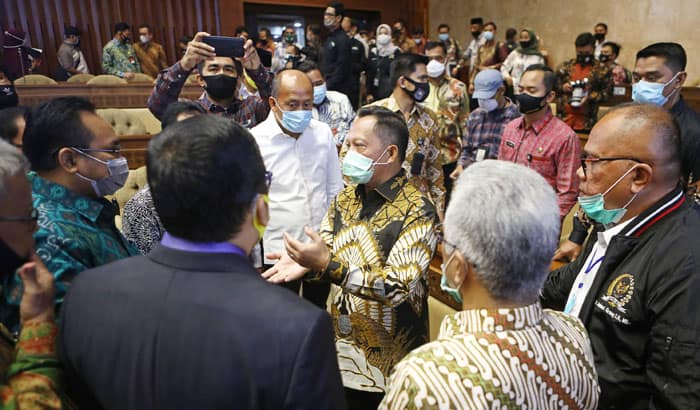 TUNDA LAGI: Mendagri Tito Karnavian berbincang dengan para anggota Komisi II DPR setelah batal melakukan rapat pembahasan Perppu Pilkada di Senayan kemarin (29/6). (HENDRA EKA/JAWA POS)