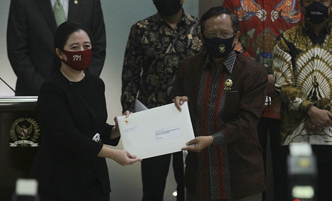 Ketua DPR Puan Maharani menerima Surat Presiden (Surpres) tentang usulan Rancangan Undang-Undang Badan Pembinaan Ideologi Pancasila (RUU BPIP) dari Menteri Koordinator Bidang Politik, Hukum dan Keamanan (Menko Polhukam) Mahfud MD di Kompleks Parlemen, Se