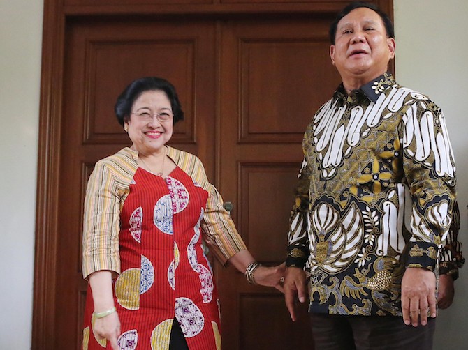 Ketua Umum PDI Perjuangan Megawati Soekarnoputri bertemu dengan Ketua Umum Partai Gerindra Prabowo Subianto di kediaman Jalan Teuku Umar, Jakarta, Rabu (24/7/2019). Pertemuan ini berlangsung santai dan keduanya terlihat bercanda tawa. FOTO : FEDRIK TARIGA