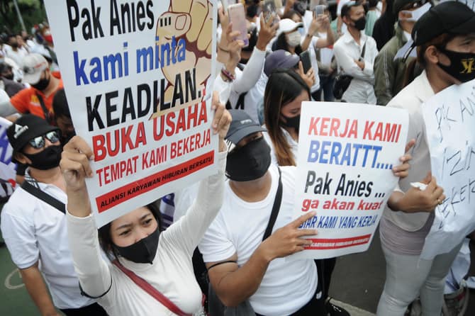 Massa yang tergabung dalam Aliansi Karyawan Hiburan dan Pengusaha Hiburan saat menggelar aksi damai di depan Balai Kota, Jakarta, Selasa (21/7/2020). Aksi Karyawan Hiburan Malam Geruduk Kantor Anies Baswedan. Dalam aksinya mereka meminta Gubernur DKI Jaka
