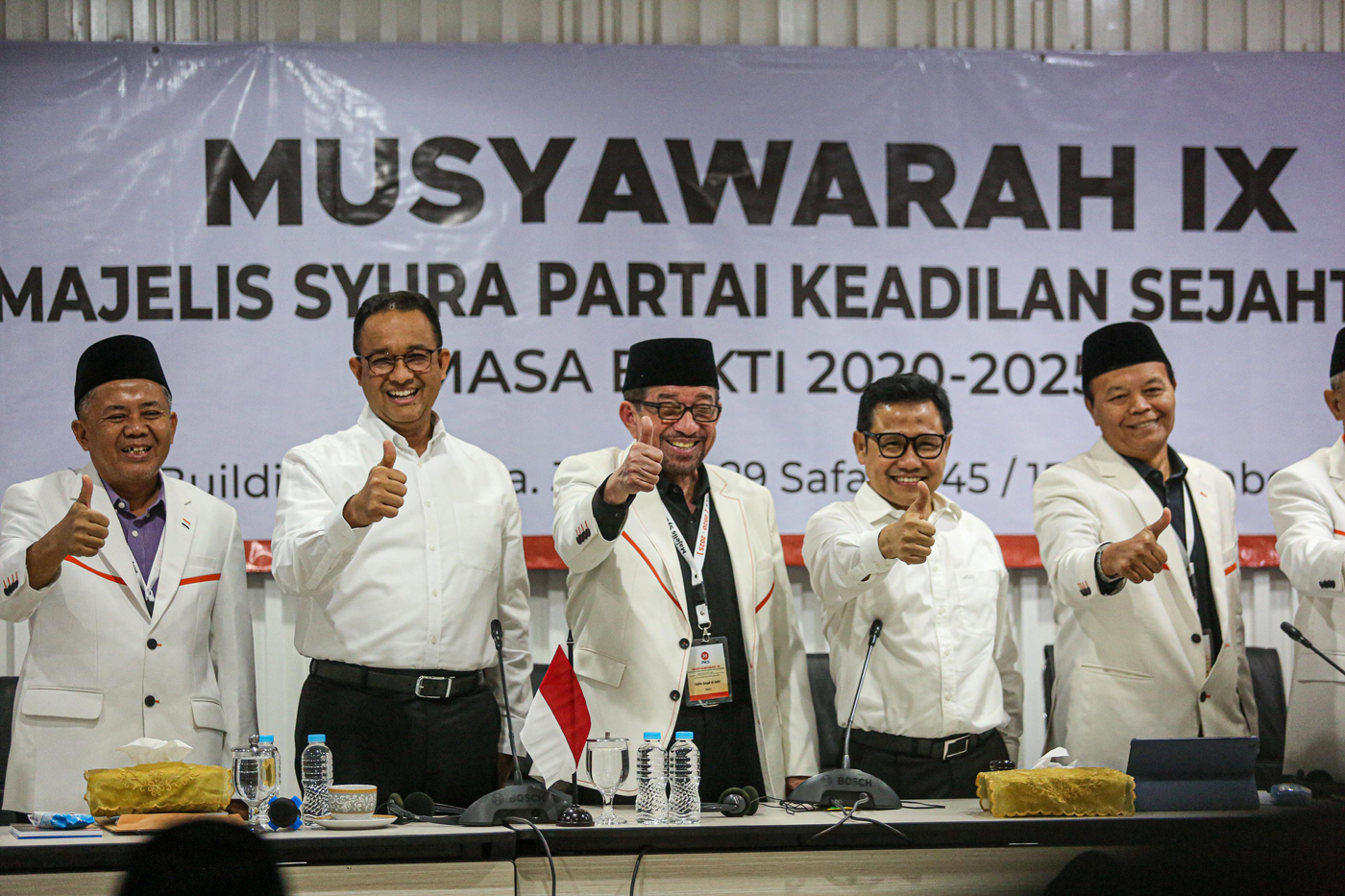 Pasangan Bakal Calon Presiden Anies Baswedan (kedua kiri) dan Bakal Calon Wakil Presiden Muhaimin Iskandar (kedua kanan) , Ketua Majelis Syuro PKS Salim Segaf Al Jufri (tengah) serta anggota Majelis Syuro PKS usai mengikuti Rapat Majelis Syuro PKS di Kan