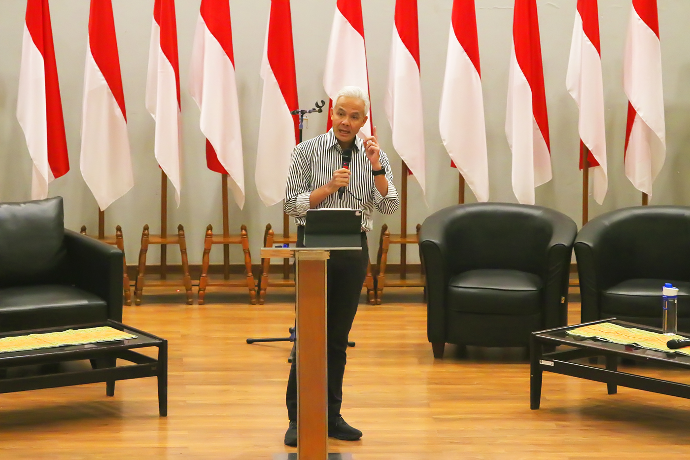 Bacapres dari PDIP Ganjar Pranowo mengisi kuliah kebangsaan di Fakultas Ilmu Sosial dan Poltik (FISIP) Universitas Indonesia, Depok, Jawa Barat, Senin, (18/9/2023).