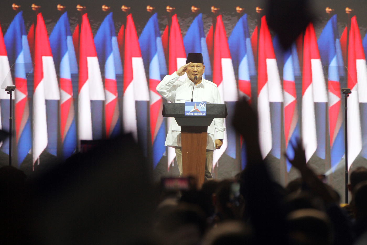 Ketum Partai Gerindra Prabowo Subianto memberi hormat kepada para Kader partai Demokrat saat rapat pimpinan nasional (Rapimnas) Partai Demokrat di Jakarta, Kamis (21/9/2023).