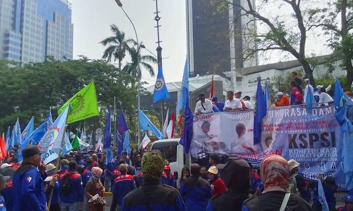 Ratusan buruh dari elemen Konfederasi Serikat Pekerja Seluruh Indonesia (KSPSI) hingga Partai Buruh masih bertahan di tengah teriknya matahari di kawasan Patung Kuda, Jakarta Pusat.