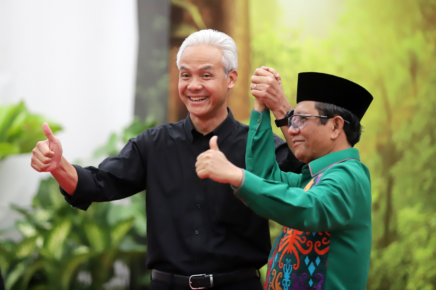 Bakal calon presiden dari PDI Perjuangan (PDIP) Ganjar Pranowo dan bakal calon wakil presiden Mahfud MD saat acara pengumuman bakal calon wakil presiden pada Pilpres 2024 di kantor DPP PDIP, Jakarta, Rabu (18/10/2023).