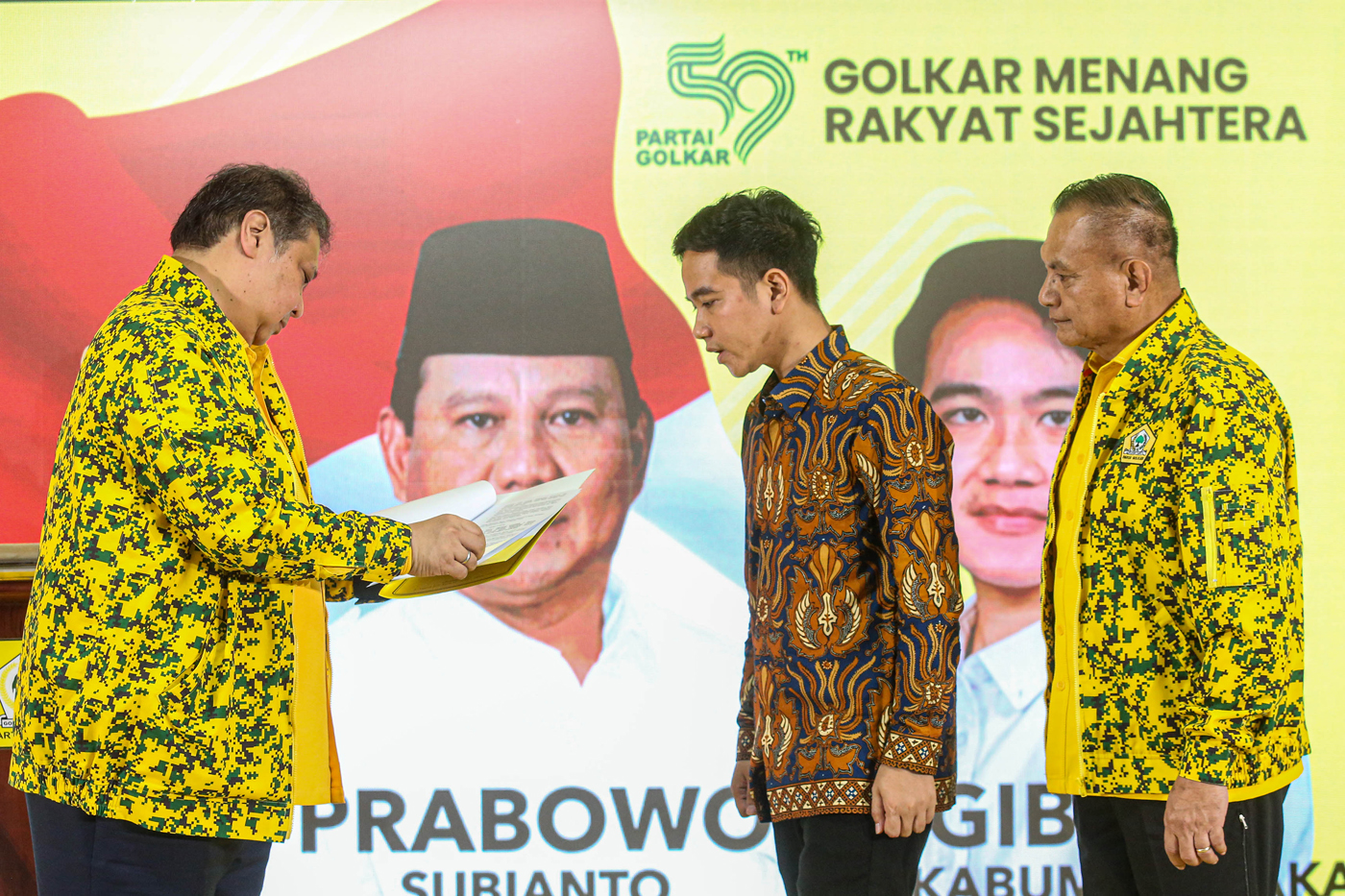 Ketua Umum Partai Golkar Airlangga Hartarto (kiri) didampingi Sekjen Lodewijk Freidrich Paulus (kanan) menyerahkan surat keputusan Rapimnas ke-2 Partai Golkar kepada Walikota Solo Gibran Rakabuming Raka di Kantor DPP Partai Golkar, Jakarta, Sabtu (21/10/2
