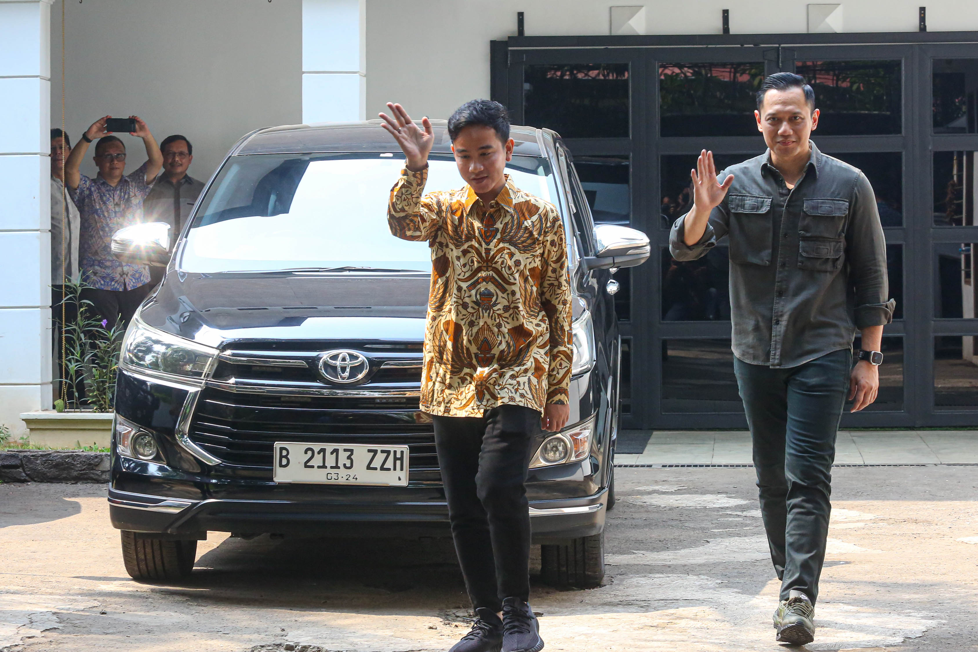 Wali Kota Solo Gibran Rakabuming Raka bersama Ketua Umum Partai Demokrat Agus Harimurti Yudhoyono usai melakukan pertemuan tertutup di Jakarta, Minggu (22/10/2023).