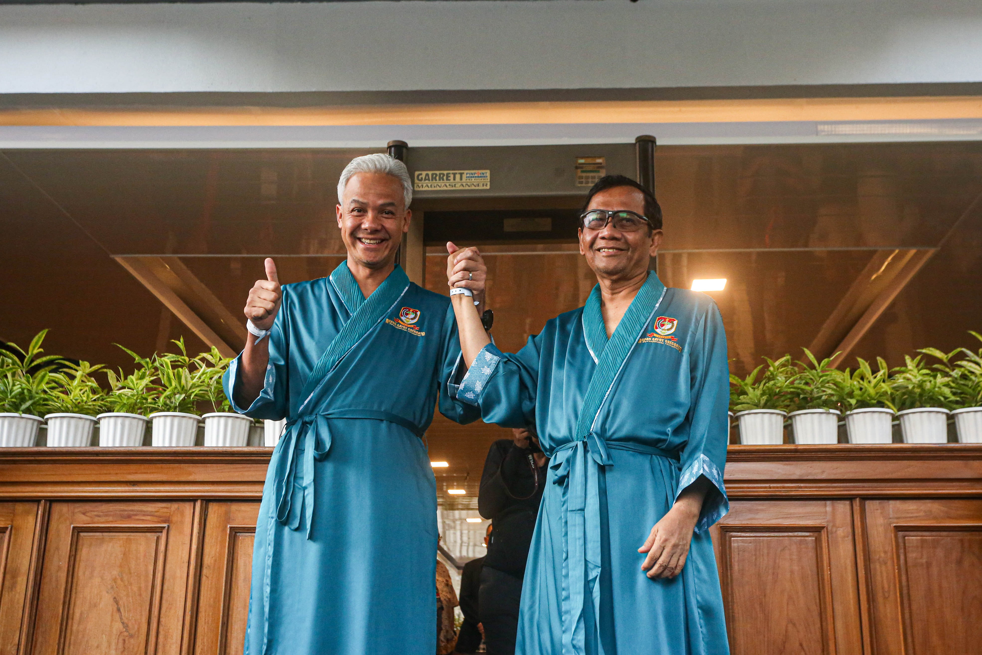 Bakal calon presiden dan wakil presiden Ganjar Pranowo dan Mahfud MD sebelum menjalani pemeriksaan kesehatan di RSPAD Gatot Soebroto, Jakarta, Minggu (22/10/2023).