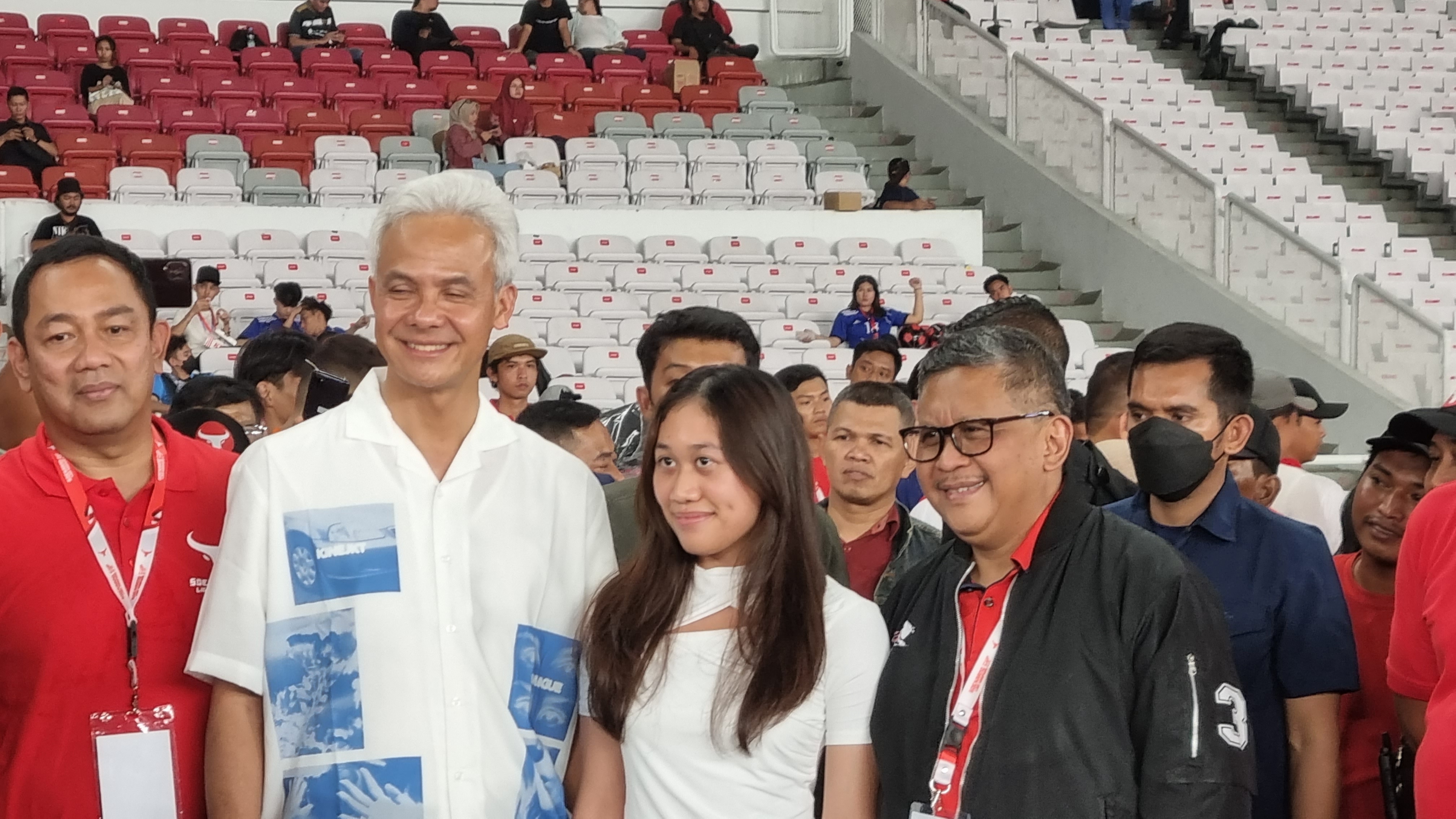 Bakal calon presiden (capres) Ganjar Pranowo bersama elite PDIP di Stadion Utama Gelora Bung Karno (SUGBK), Senayan, Jakarta, Jumat (3/11) malam