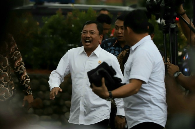 Menteri Kesehatan (Menkes) Terawan Agus Putranto saat menyapa wartawan di Bandara Halim Perdana Kusuma, Jakarta, Sabtu (15/2/2019). Menkes menegaskan 238 WNI tersebut dalam keadaan sangat sehat. Dalam proses pemulangan 238 WNI tersebut juga didampingi ole