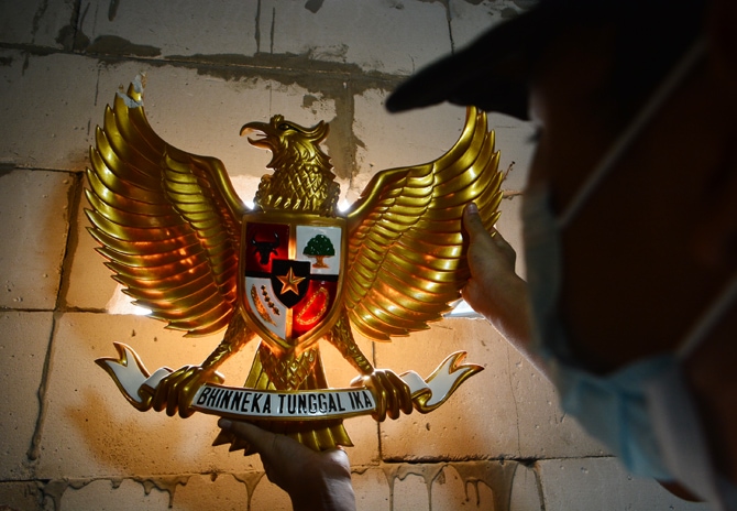 Perajin saat menyelesaikan pembuatan patung Garuda Pancasila di industri rumahan kawasan Bali Raya, Kalimalang, Jakarta Timur, Selasa (1/7/2021). Dalam sehari perajin mampu memproduksi hingga 15 patung Garuda Pancasila. Harga patung Garuda Pancasila ini d