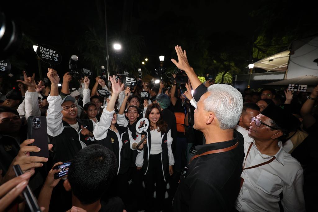 Pasangan calon presiden dan calon wakil presiden (capres-cawapres) Ganjar Pranowo dan Mahfud MD bersama para pendukungnya usai mendapat nomor urut 3 sebagai peserta Pilpres 2024 di luar gedung KPU.