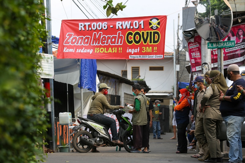 Suasana penerapan mikro lockdown di perkampungan Jalan Madrasah RT 006 RW 001 Gandaria Selatan, Cilandak, Jakarta Selatan, Selasa (22/6/2021). Pemerintah Provinsi DKI Jakarta menerapkan mikro lockdown di kampung tersebut lantaran adanya 17 warga yang posi