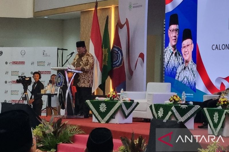 Calon Presiden nomor urut 2 Prabowo Subianto saat Dialog Terbuka Muhammadiyah di Universitas Muhammadiyah Surabaya, Jumat (24/11/2023) - Image
