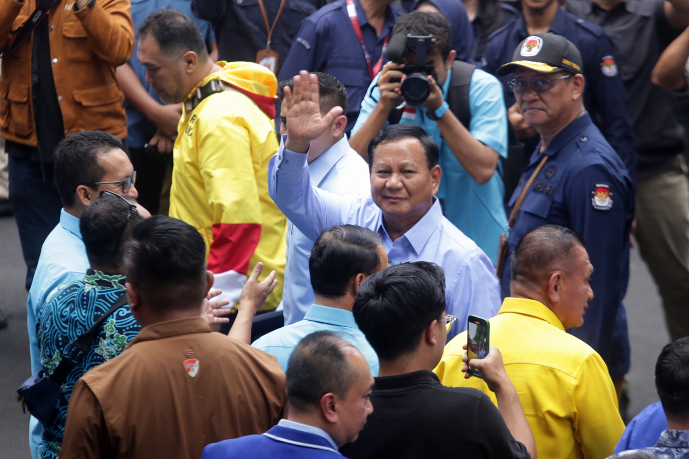 Calon presiden dan wakil presiden nomor urut dua Prabowo Subianto dan Gibran Rakabuming Raka pada acara Deklarasi Kampanye Pemilu Damai 2024 di kompleks Kantor KPU, Jakarta, Senin (27/11/2023).