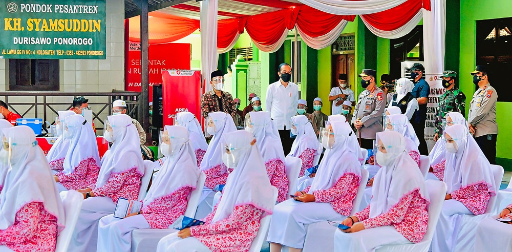TINJAU LANGSUNG: Presiden Jokowi meninjau kegiatan vaksinasi bagi para santri di Pondok Pesantren KH Syamsuddin, Kabupaten Ponorogo, kemarin (7/9). (LAILY RACHEV/SETPRES)