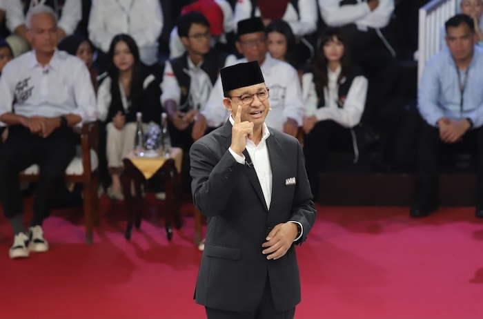 Capres nomor urut 1 Anies Baswedan dipotong ucapannya oleh Prabowo Subianto saat debat capres perdana di KPU RI, Selasa (12/12).