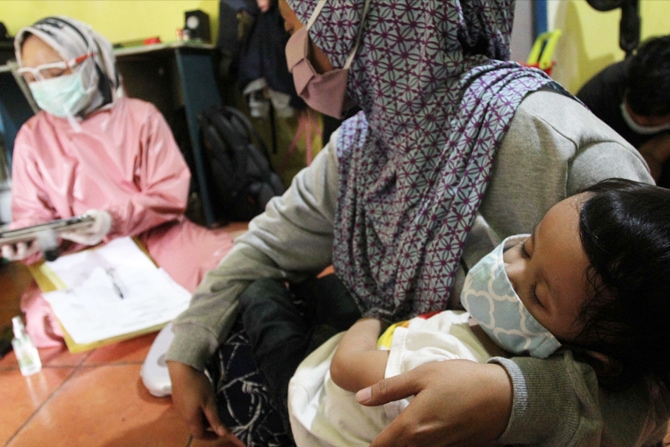 Petugas Kesehatan dari Puskesmas Kebayoran Lama di bawah Suku Dinas Kesehatan Jakarta Selatan melakukan pemeriksaan tumbuh kembang anak di Kawasan Bungur, Kebayoran Lama, Jakarta, Rabu (16/12/2020). Kegiatan rutin ini dalam program pencegahan stunting, u