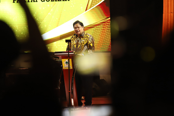 Ketua Umum DPP Partai Golkar Airlangga Hartarto menyampaikan pidato nya dalam malam puncak HUT Partai Golkar Ke-57 di Jakarta, Sabtu (23/10/2021) malam. Momen HUT tersebut menjadi ajang pemantapan konsolidasi untuk memenangkan agenda-agenda politik sekali