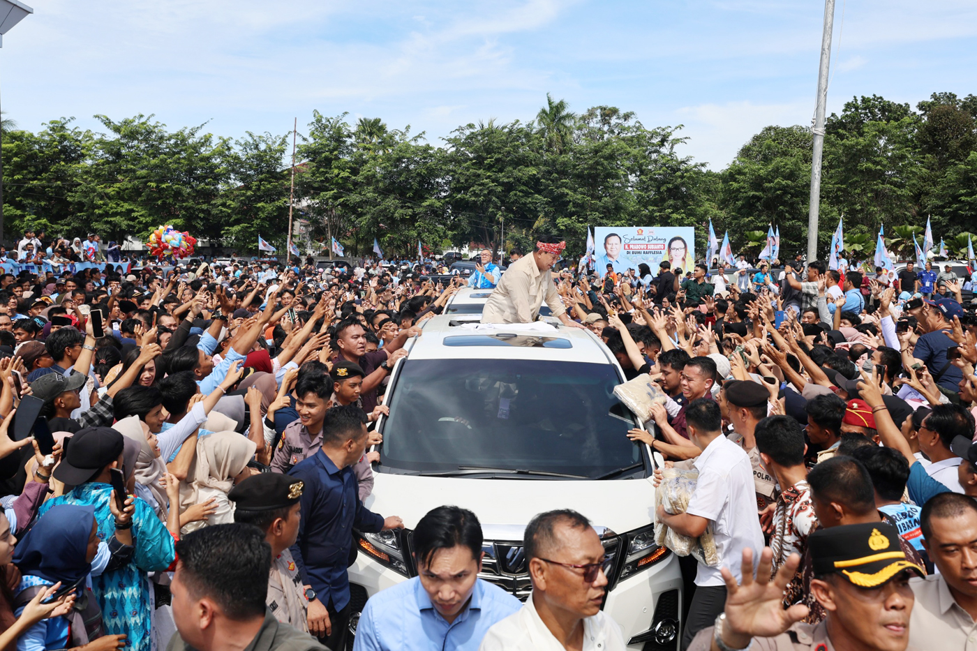 Calon presiden nomor urut 2 Prabowo Subianto menyapa relawan saat menghadiri konsolidasi pemenangan Prabowo-Gibran di Kota Bengkulu, Bengkulu, Kamis (11/1/2024).